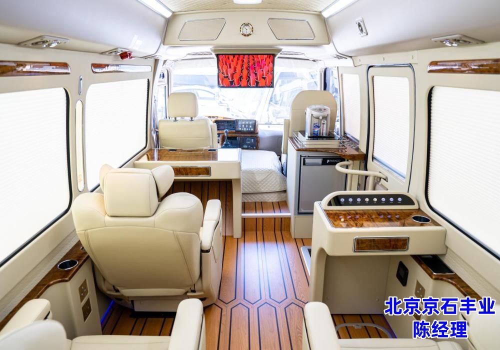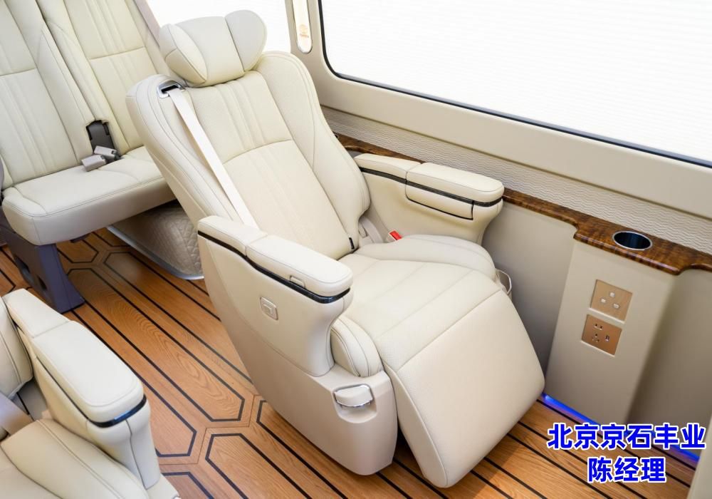 车内最引人注目的当属那三张精心设计的豪华航空座椅,它们无疑是这款定制商务车的一大亮点。这些座椅采用了顶级的材质和先进的工艺制造,具备多项电动调节功能,能够满足不同乘客对于舒适坐姿的需求。座椅的靠背可电动调节角度,从微微后仰到近乎完全平躺,乘客可以根据自己的喜好和需求轻松调整,无论是长途旅行中的休息,还是短暂的放松小憩,都能找到最舒适的姿势。座椅的坐垫同样支持电动调节,可前后移动、高低调节,还具备按摩功能。通过内置的按摩装置,能够模拟多种按摩手法,如揉捏、推拿、拍打等,为乘客缓解旅途疲劳,带来极致的舒适享受。座椅还配备了全独立头枕,头枕的高度和角度均可单独调节,能够为乘客的头部和颈部提供恰到好处的支撑,避免在行车过程中因头部晃动而产生的不适。此外,每张航空座椅还配备了独立的扶手,扶手上集成了座椅调节按钮和杯架,方便乘客操作座椅功能的同时,也能放置水杯等物品,设计十分贴心。这三张豪华航空座椅采用顺向布局,不仅符合人体工程学原理,让乘客在行车过程中更加舒适,还能有效避免因逆向乘坐而产生的头晕、恶心等不适症状。同时,顺向布局也更有利于乘客之间的交流与互动,无论是进行商务洽谈,还是分享旅途见闻,都能营造出轻松、融洽的氛围。