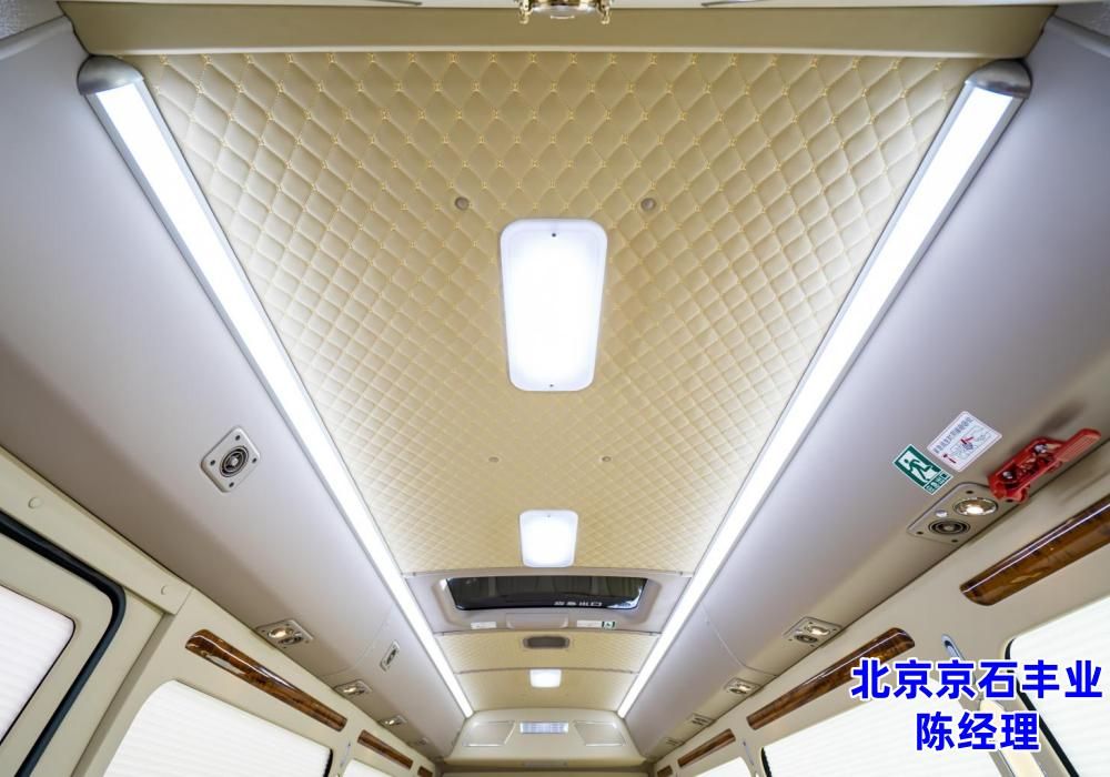 为了丰富乘客在旅途中的娱乐生活,这款定制商务车还配备了吸顶电视。吸顶电视安装在车顶中部,位置适中,无论是前排还是后排的乘客都能清晰观看。电视屏幕尺寸较大,画质清晰,色彩鲜艳,能够为乘客带来出色的视觉体验。通过连接车载多媒体系统,吸顶电视可以播放各种视频内容,如电影、电视剧、音乐视频等,让乘客在旅途中不再感到无聊。在商务出行中,吸顶电视还可用于播放商务演示资料、会议视频等,为商务活动提供便利。此外,车载多媒体系统还支持蓝牙连接,乘客可以通过手机或其他移动设备连接到系统,播放自己喜欢的音乐或视频,满足个性化的娱乐需求。