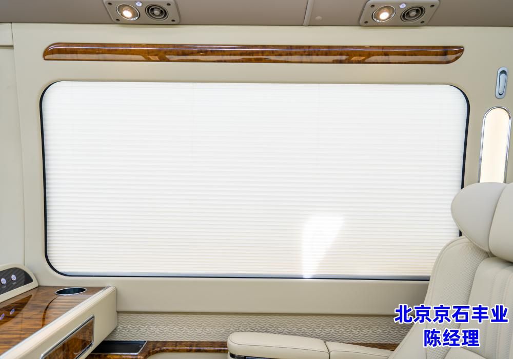 车内配备的电动升降窗帘为乘客提供了更高的隐私保障和舒适体验。窗帘采用高品质的遮光面料制作,不仅能够有效阻挡外界的光线,营造出私密的车内空间,还能在一定程度上起到隔热、保温的作用,使车内温度更加稳定。电动升降功能的设计非常人性化,乘客只需轻轻按下按钮,窗帘就能自动升降,操作简便快捷。在需要与外界保持联系或欣赏车外风景时,可将窗帘升起,让阳光和美景尽情洒入车内;而在需要休息或进行私密商务洽谈时,则可将窗帘降下,为车内创造一个安静、私密的空间。窗帘的颜色与车内米色内饰相协调,采用了浅色系的设计,既不会过于突兀,又能与整体内饰风格相融合,进一步提升了车内的美观度。